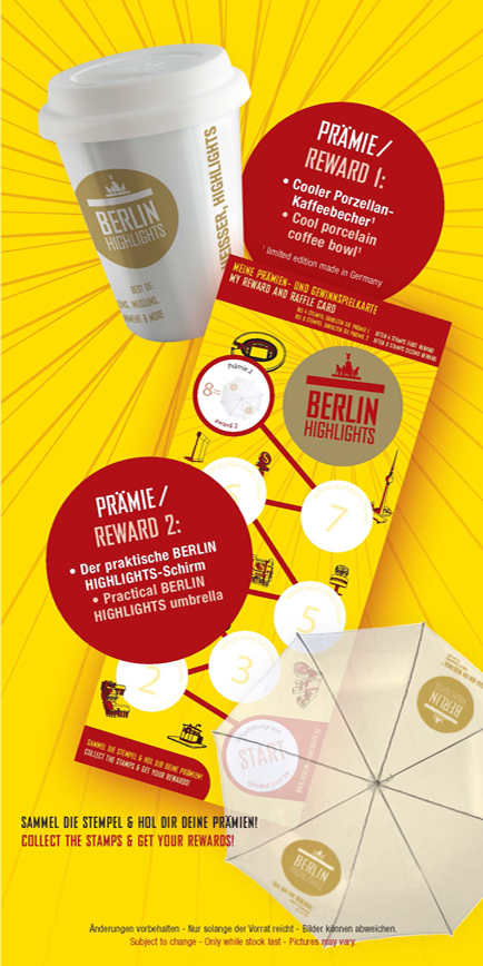 Secure yourself exclusive BERLIN HIGHLIGHTS rewards by visiting four or even eight BERLIN HIGHLIGHTS and by getting a stamp at each of the BERLIN HIGHLIGHTS partners‘ locations. You will receive your reward/s by handing in your reward and raffle card at one of the BERLIN HIGHLIGHTS partners or by sending it.